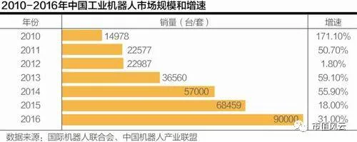 更有机构预测,中国在汽车、电子电气、食品饮料、化工、塑料橡胶、金属制品这六大工业领域,未来几年需要108万-240万台工业机器人,占工业机器人总需求量的70%左右。
