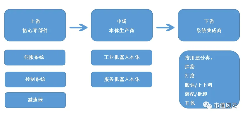 中游是本体生产商,包括工业机器人本体、服务机器人本体;