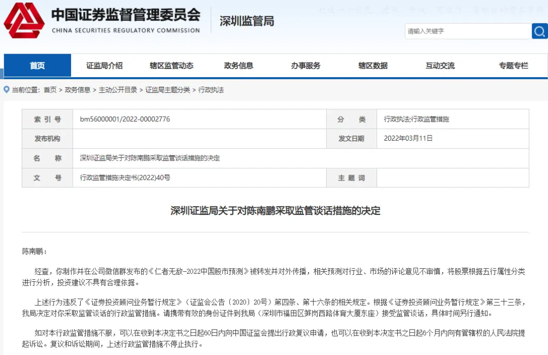 3月11日,深圳证监局发布对陈南鹏采取监管谈话措施的决定。决定显示,经查,陈南鹏制作并在公司微信群发布的《仁者无敌-2022中国股市预测》被转发并对外传播,相关预测对行业、市场的评论意见不审慎,将股票根据五行属性分类进行分析,投资建议不具有合理依据。