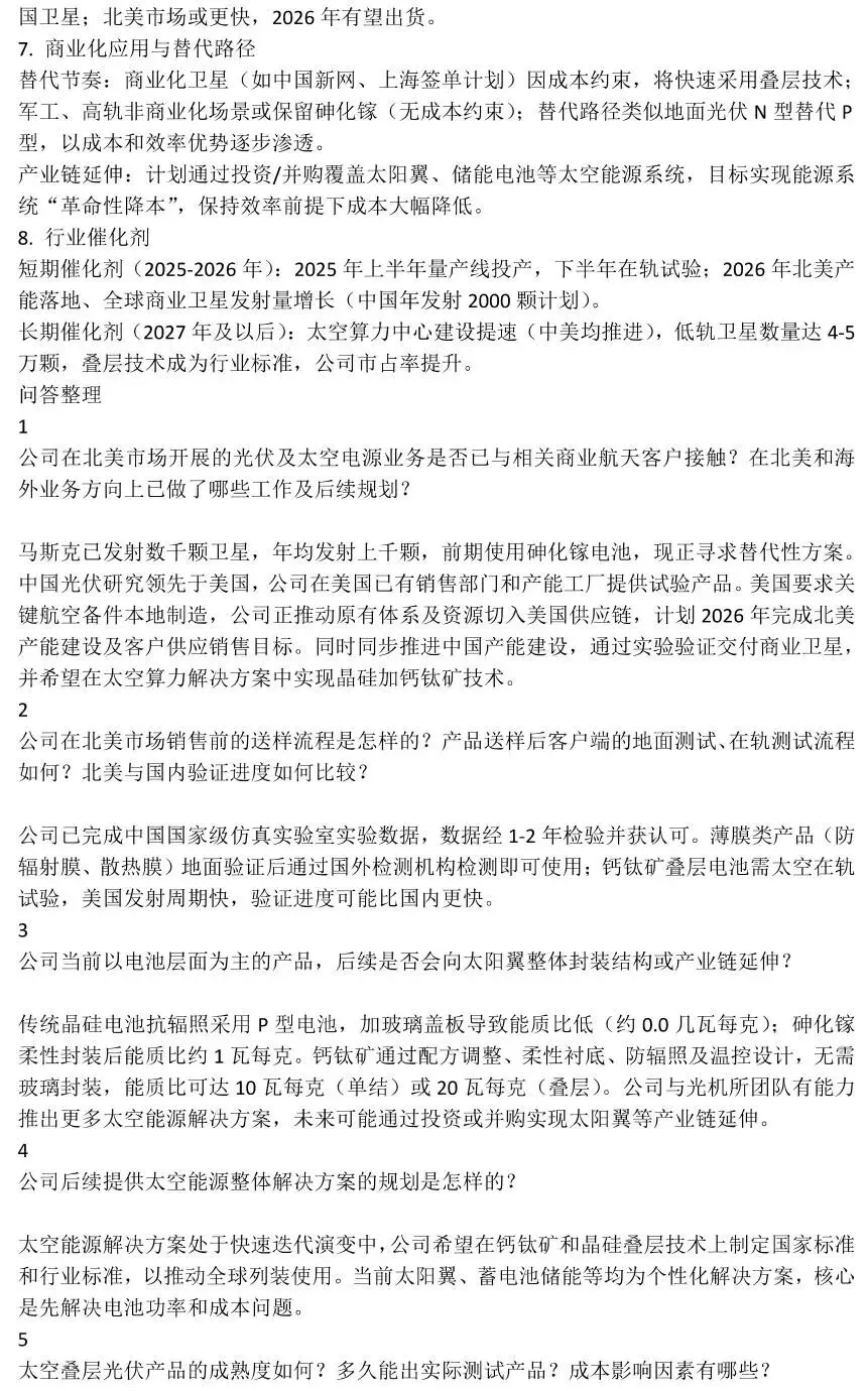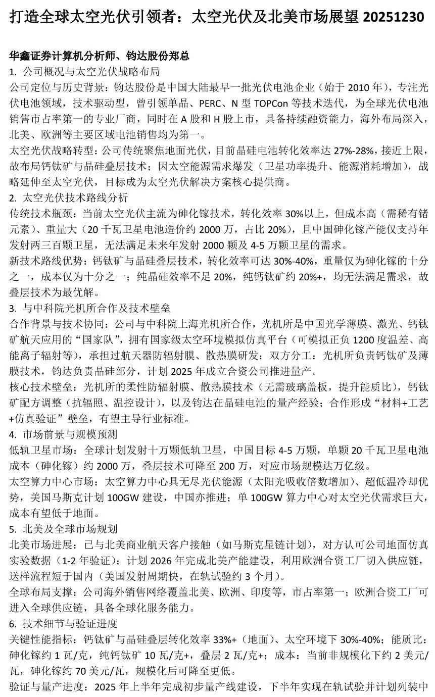 1、2026年,钧达&尚翼将主要完成美国和国内钙钛矿叠层试验线的建设、送样以及在轨验证。尚翼是目前全球唯一一家连续谱测试机构,得益于国家级太空仿真实验室的实验数据,公司产品整体推广速度有望较快。此外,尚翼团队的美国留学工作背景、联合创始人的美国资源以及钧达的全球化产能及渠道优势,亦进一步加速产品在北美的拓展,目前公司已经开始在美国做销售以及产能建设的准备工作。