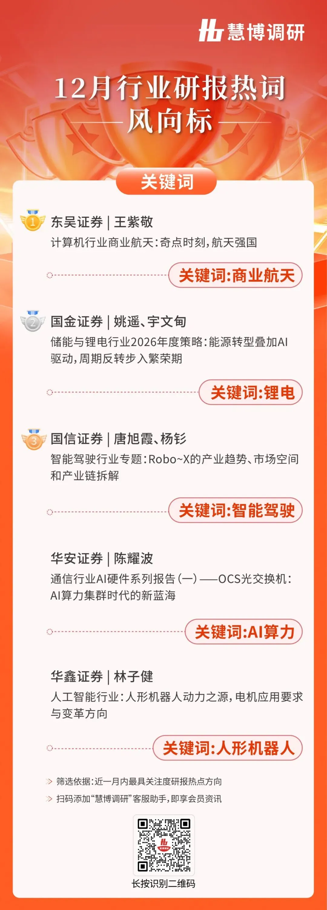 通过慧博投研“600W+注册用户,90%机构用户”的庞大客户群体,本月我们揭晓2025年12月行业研报两大榜单——“行业研报热词风向标”、“重获券商青睐公司研报TOP榜”。本次榜单的评选基于深入的数据分析和严谨的评选指标,全方位展现市场热点与企业潜力,旨在为读者提供精准、前瞻的市场洞察,助力把握投资先机。