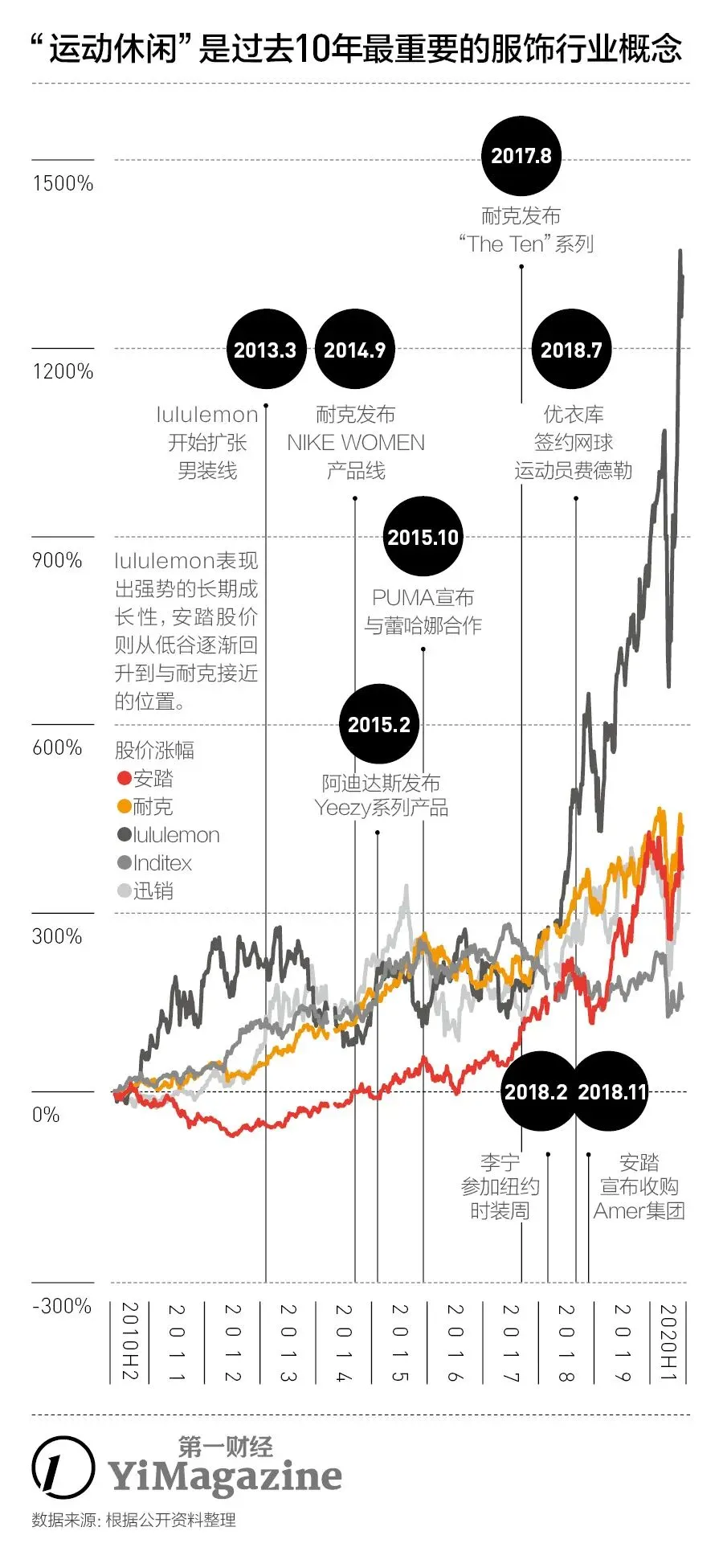 如果放在一个10年的观察周期,lululemon的股价已升值12倍有余,安踏与耐克同期的股价变化都在3至4倍范围内。它所代表的,可能就是运动休闲潮流目前以公司形态存在的最佳答案:既能将面料研发能力与版型剪裁充分结合,也能关注设计层面的美学细节,社群和生活方式则是品牌价值最终的放大器。对于已经解决了日常业绩和财务表现这些面子问题,却仍时时困惑“我到底是谁”这种里子问题的安踏而言,向这一方向探索的过程,也许真的要“永不止步”。