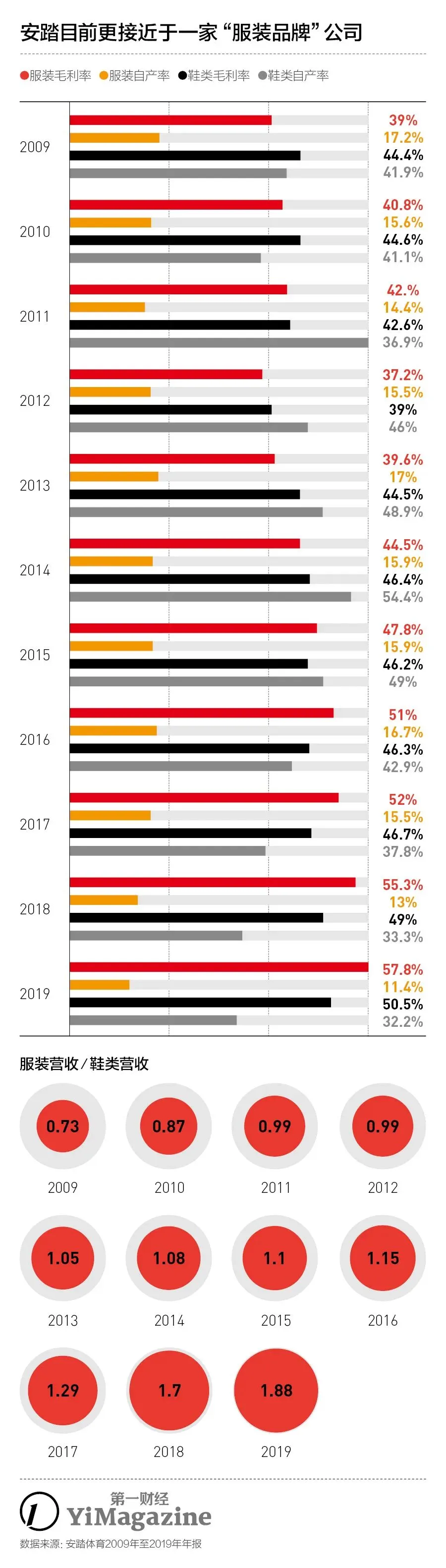将业绩重心放在衣服而非鞋上,一个显著好处在于可以通过更广泛的外包,降低生产成本,提升毛利率。从安踏近年披露的产品自产率来看,2013年17%左右的服装自产率是最高位,2019年已经降至11.4%。在降本的同时,服装的毛利率则从不到40%升至目前近60%的水平。同期,安踏超过30%的运动鞋为自产,但通过自行采购原料,以及将鞋底、鞋面等环节拆分等做法,仍能保证50%以上的毛利率。