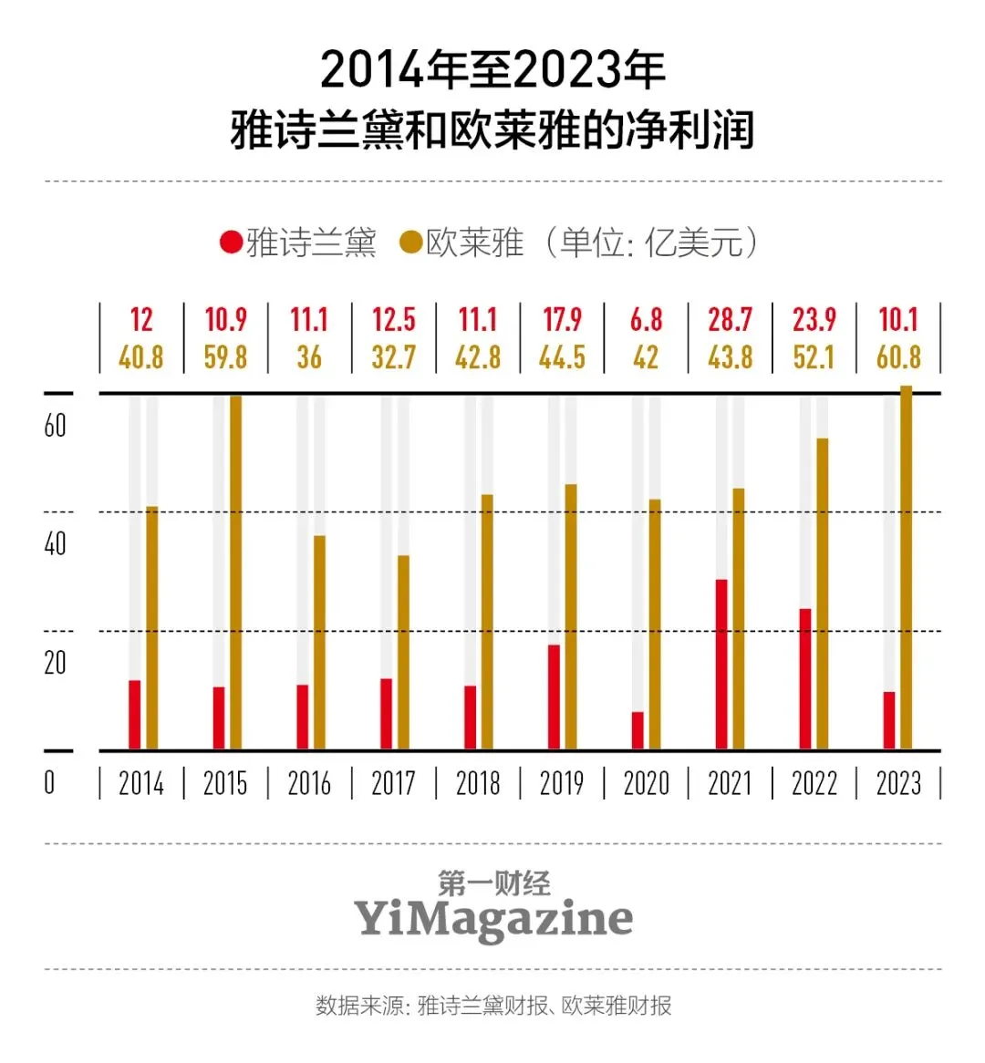 雅诗兰黛曾是“高端”美妆市场的代名词,连欧莱雅也不得不依靠组合起多个品牌,才能在营收和利润上与之抗衡。然而,业绩不断下滑不仅使雅诗兰黛逐渐成为市场上待价而沽的鱼肉,也让其他非美妆公司对抢占雅诗兰黛空出来的高端美妆市场跃跃欲试。