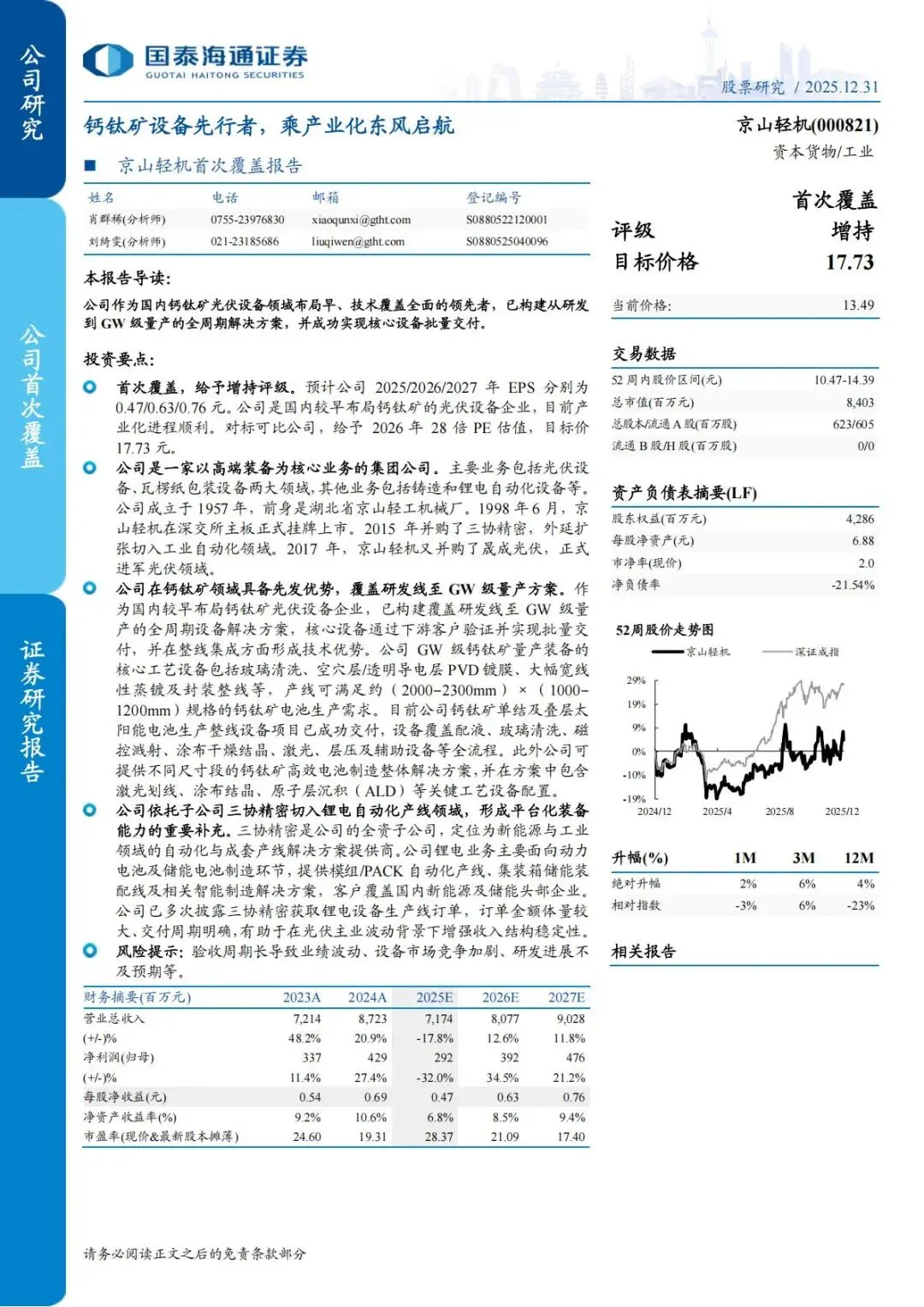 『研报』京山轻机-000821-首次覆盖报告:钙钛矿设备先行者,乘产业化东风启航