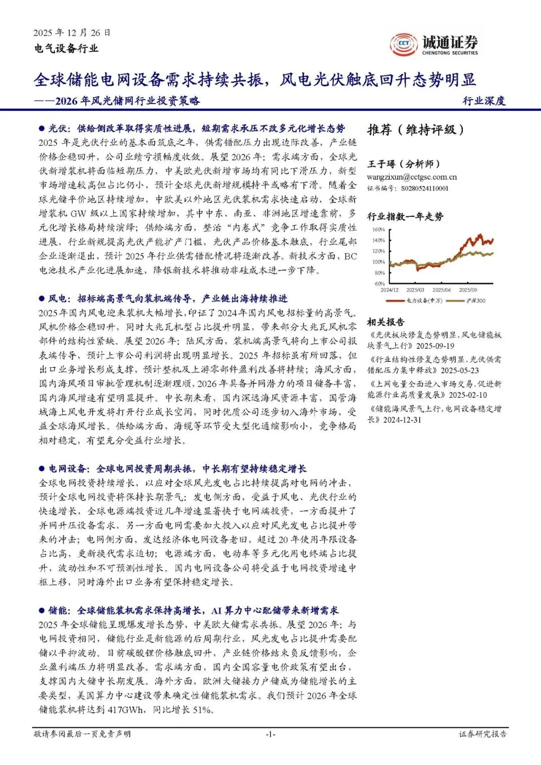 一是高景气储能环节,受益于全球大储需求共振与 AI 算力中心配储增量,关注储能电池、储能变流器及系统集成龙头;二是风电产业链,重点布局陆风盈利修复(整机、齿轮箱)与海风高增长(海缆、桩基)相关标的;三是电网与出海机会,把握特高压、配网设备国产替代与海外扩张机遇;四是光伏新技术标的,聚焦 BC 电池、降银技术等具备差异化竞争优势的企业。