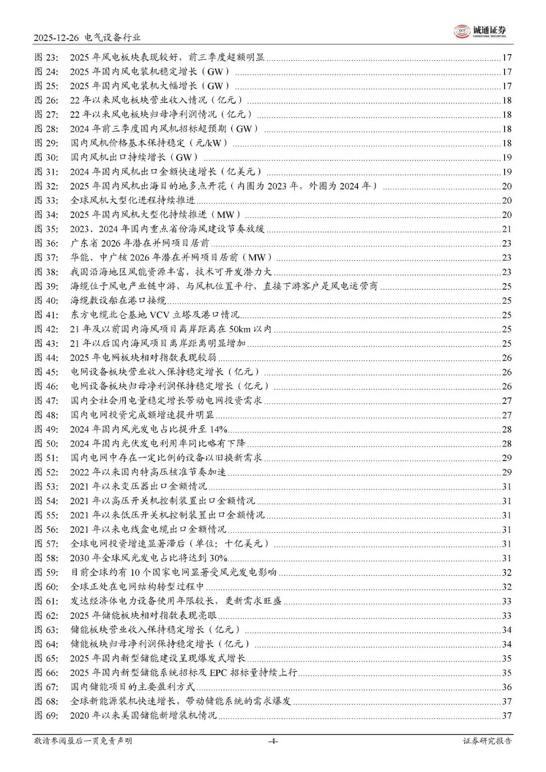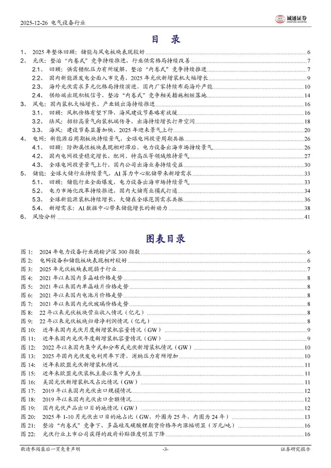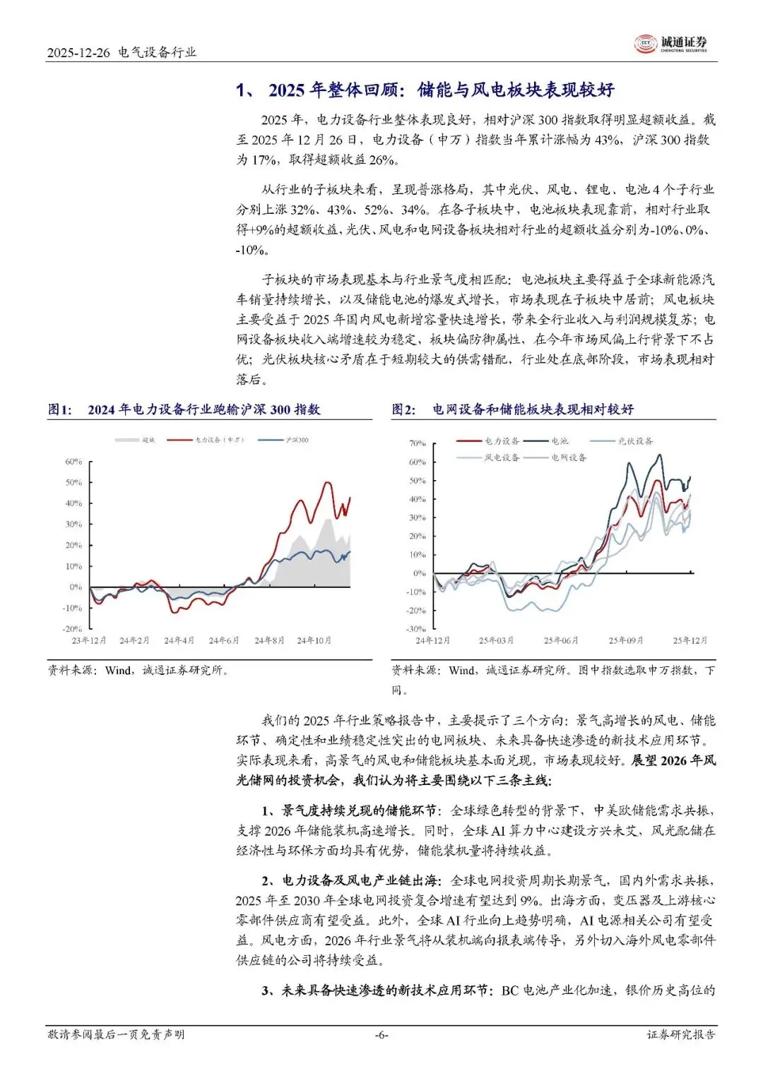 2025 年电力设备行业整体表现亮眼,申万电力设备指数全年上涨 43%,较沪深 300 指数取得 26% 的超额收益。细分板块呈现差异化行情:储能(涨 58%)、风电(涨 43%)板块受益于景气爆发领跑,光伏(涨 32%)因供需错配表现相对滞后,电网设备(涨 34%)则凭借防御属性平稳增长。展望 2026 年,行业将呈现 “储能高增、风电盈利修复、光伏触底回升、电网持续景气” 的格局,全球新能源转型与电力系统升级带来的需求共振,成为行业核心增长引擎。