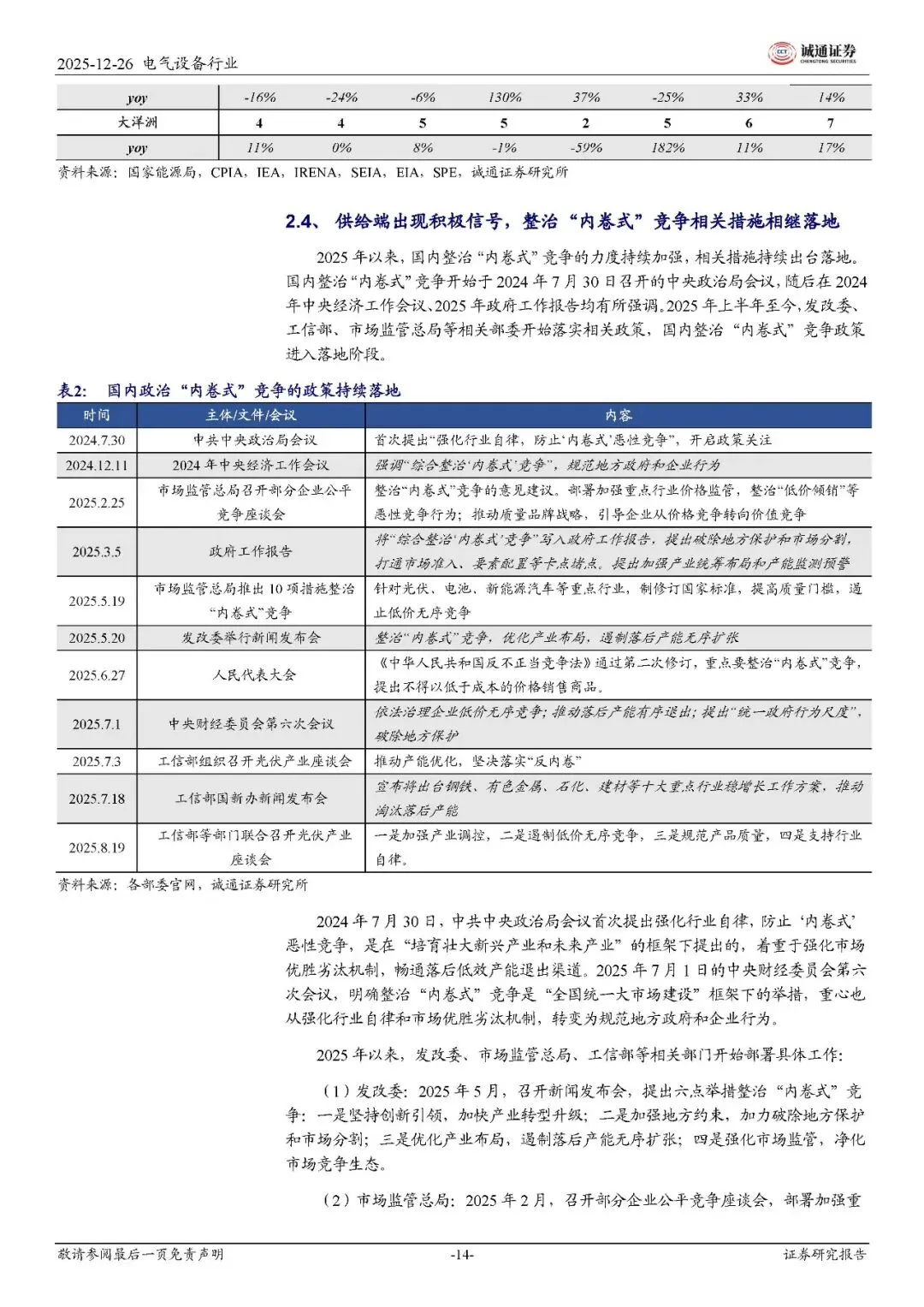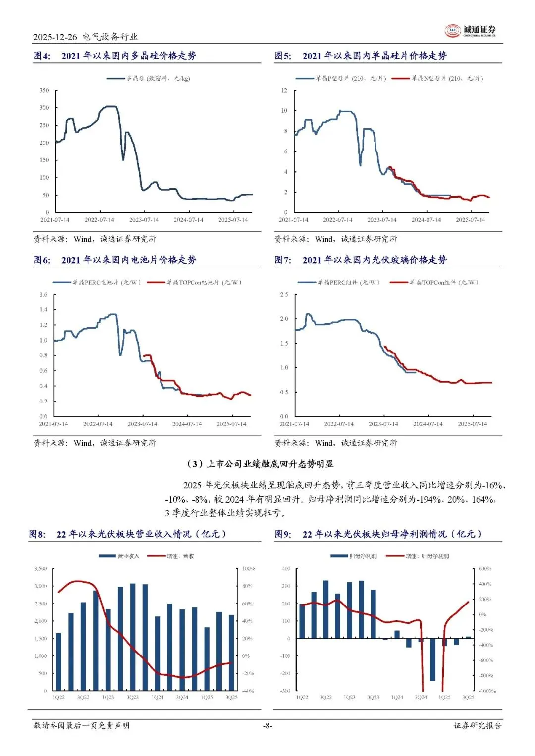 2025 年是光伏行业基本面筑底之年,核心亮点在于供给侧改革落地与需求结构优化。供给端,反内卷政策从口号转向实践,多晶硅产能整合收购平台成立,工信部通过能耗标准淘汰低效产能,推动硅料价格从 3.44 万元 / 吨的底部反弹至 5.39 万元 / 吨,涨幅超 56%。产业链价格呈现梯度传导,硅片、电池片涨幅分别达 19.42%、15.38%,但组件因产能过剩(过剩率超 169%)涨幅仅 1.91%,行业盈利分化明显,上游企业率先修复,中下游仍处承压状态。