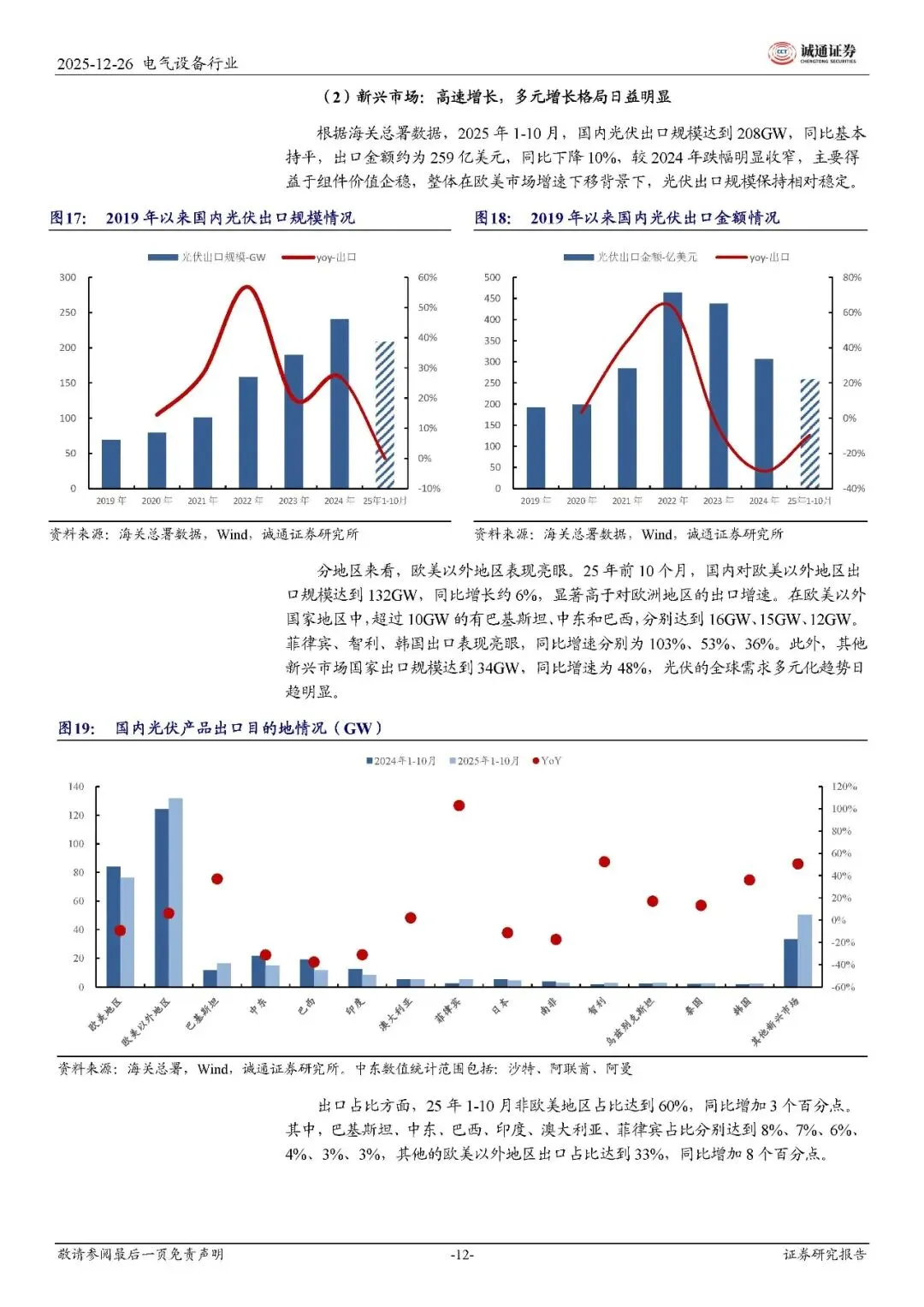 需求端呈现 “国内抢装后回落、海外多元化增长” 特征。国内受 136 号文推动,新能源上网电价全面市场化,引发 “531 抢装潮”,5 月单月装机达 92.9GW 创历史新高,全年 1-10 月新增装机 253GW,同比增长 39%。但抢装后消纳压力显现,全国光伏发电利用率降至 95%,青海、新疆等 7 省区利用率低于 90%。海外市场中,欧美进入调整期,欧盟 2025 年装机预计 65GW,美国预计 49GW,均同比持平或略降;新兴市场成为核心增量,中东、南亚、非洲地区增速靠前,2025 年国内对非欧美地区光伏出口 132GW,同比增长 6%,巴基斯坦、中东、巴西成为主要目的地。