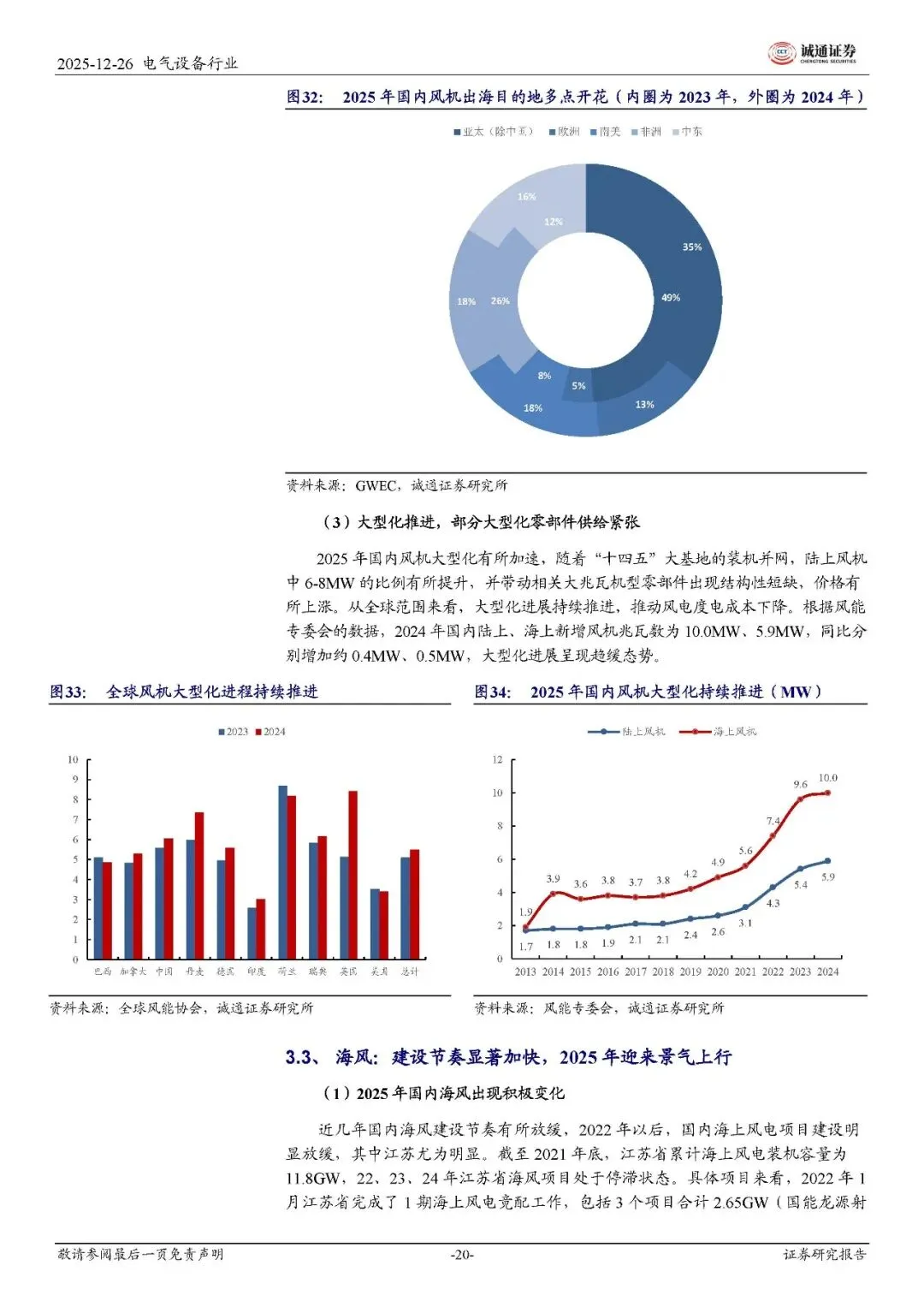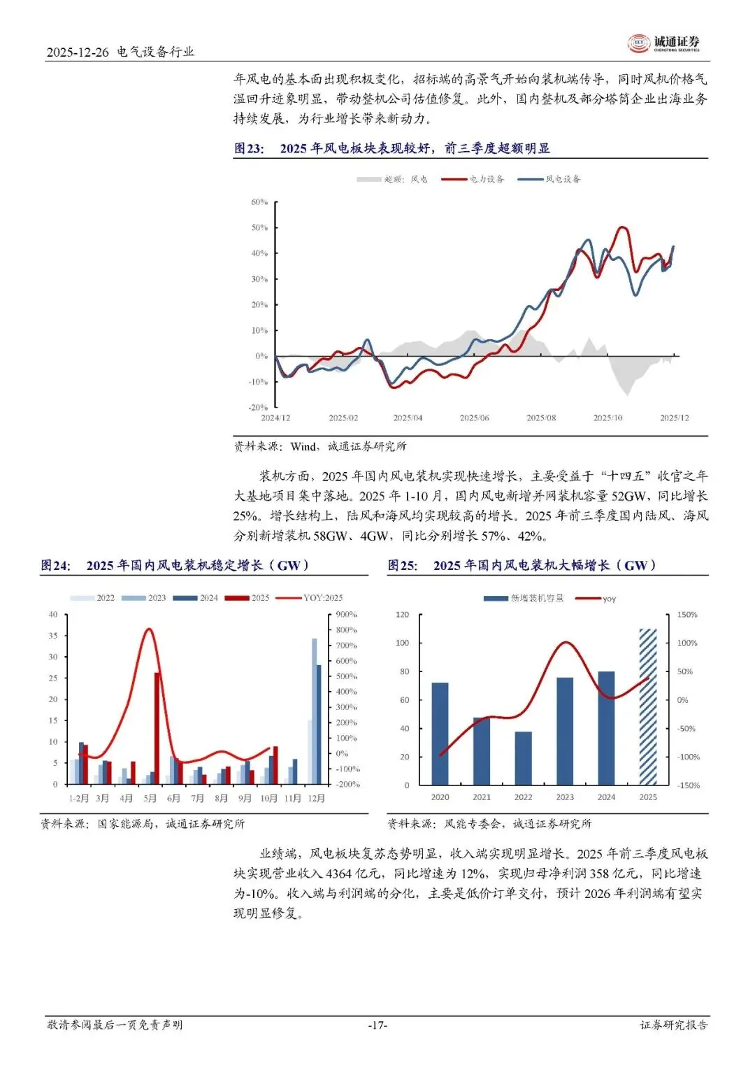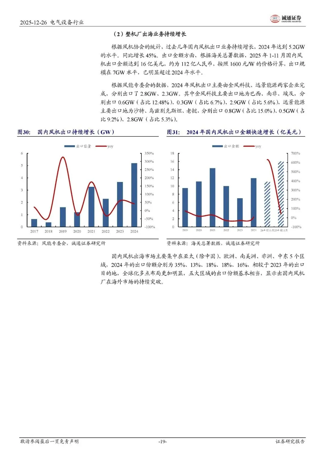 陆风方面,2026 年景气将从装机端向报表端深度传导,“十五五” 规划明确年新增装机不低于 120GW,叠加出口业务持续增长,整机及零部件企业盈利有望显著改善。2025 年国内风机出口金额达 112 亿元,出口规模超 7GW,较 2024 年大幅增长,金风科技、远景能源主导,出口目的地覆盖巴西、沙特、南非等多个区域,全球化布局成效显现。