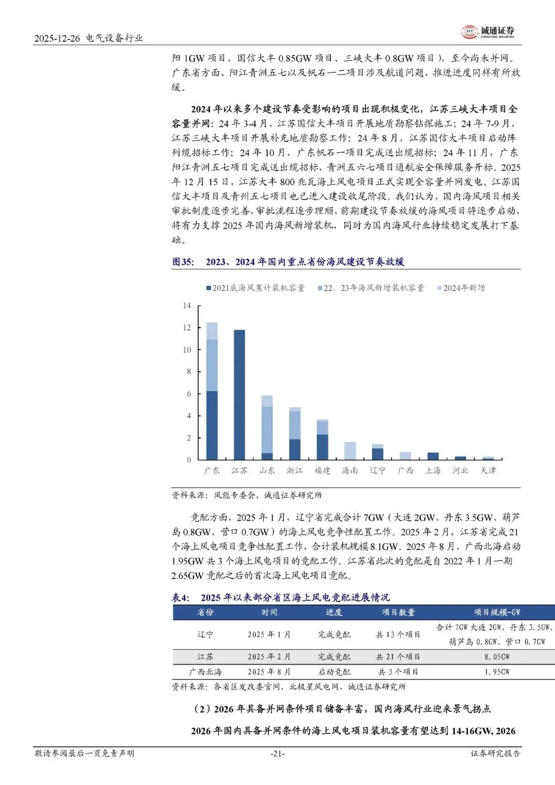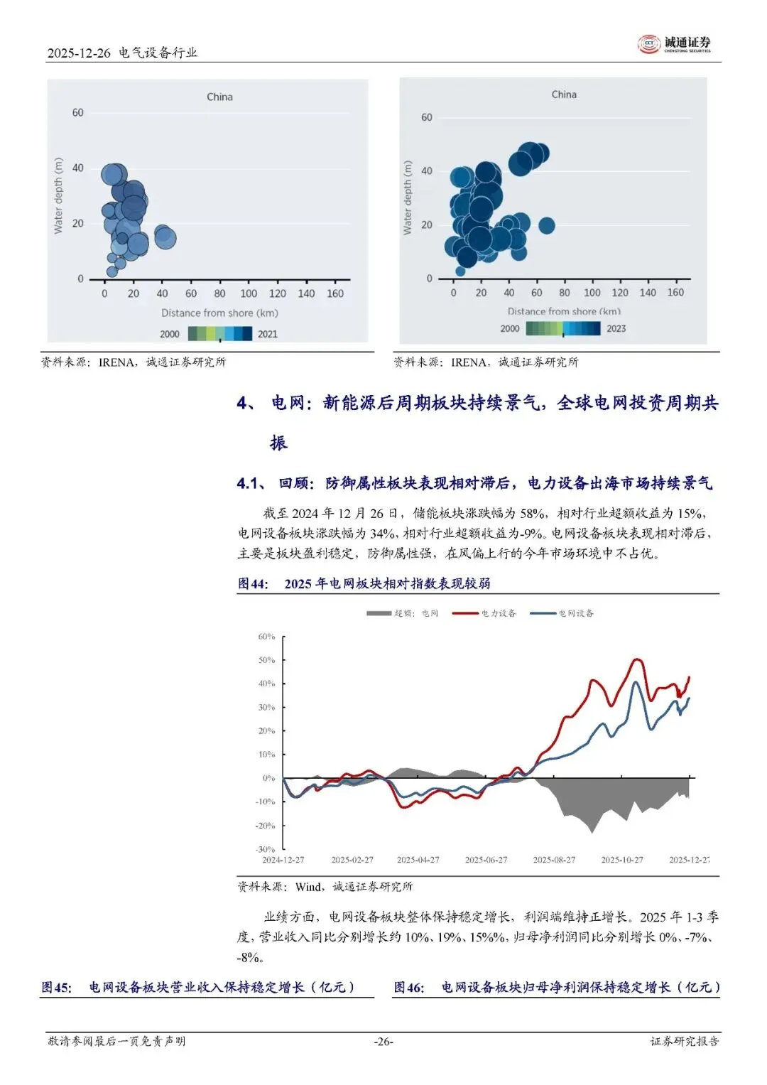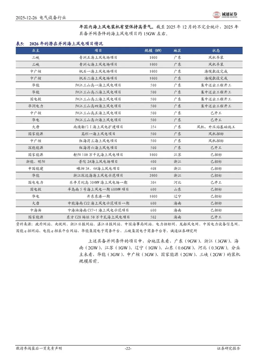陆风方面,2026 年景气将从装机端向报表端深度传导,“十五五” 规划明确年新增装机不低于 120GW,叠加出口业务持续增长,整机及零部件企业盈利有望显著改善。2025 年国内风机出口金额达 112 亿元,出口规模超 7GW,较 2024 年大幅增长,金风科技、远景能源主导,出口目的地覆盖巴西、沙特、南非等多个区域,全球化布局成效显现。