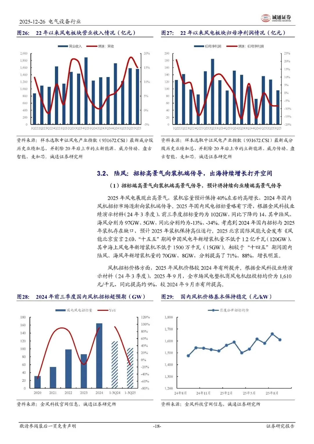 2025 年风电行业实现量利齐升,国内 1-10 月新增装机 52GW,同比增长 25%,陆风、海风分别同比增长 57%、42%,印证 2024 年高招标景气向装机端传导。风机价格企稳回升,9 月投标均价 1610 元 / 千瓦,同比提高 9%,大兆瓦机型占比提升带动齿轮箱、主轴等零部件结构性紧缺。业绩端,风电板块前三季度营业收入 4364 亿元,同比增长 12%,虽因低价订单交付导致净利润同比略降 10%,但盈利修复趋势明确。