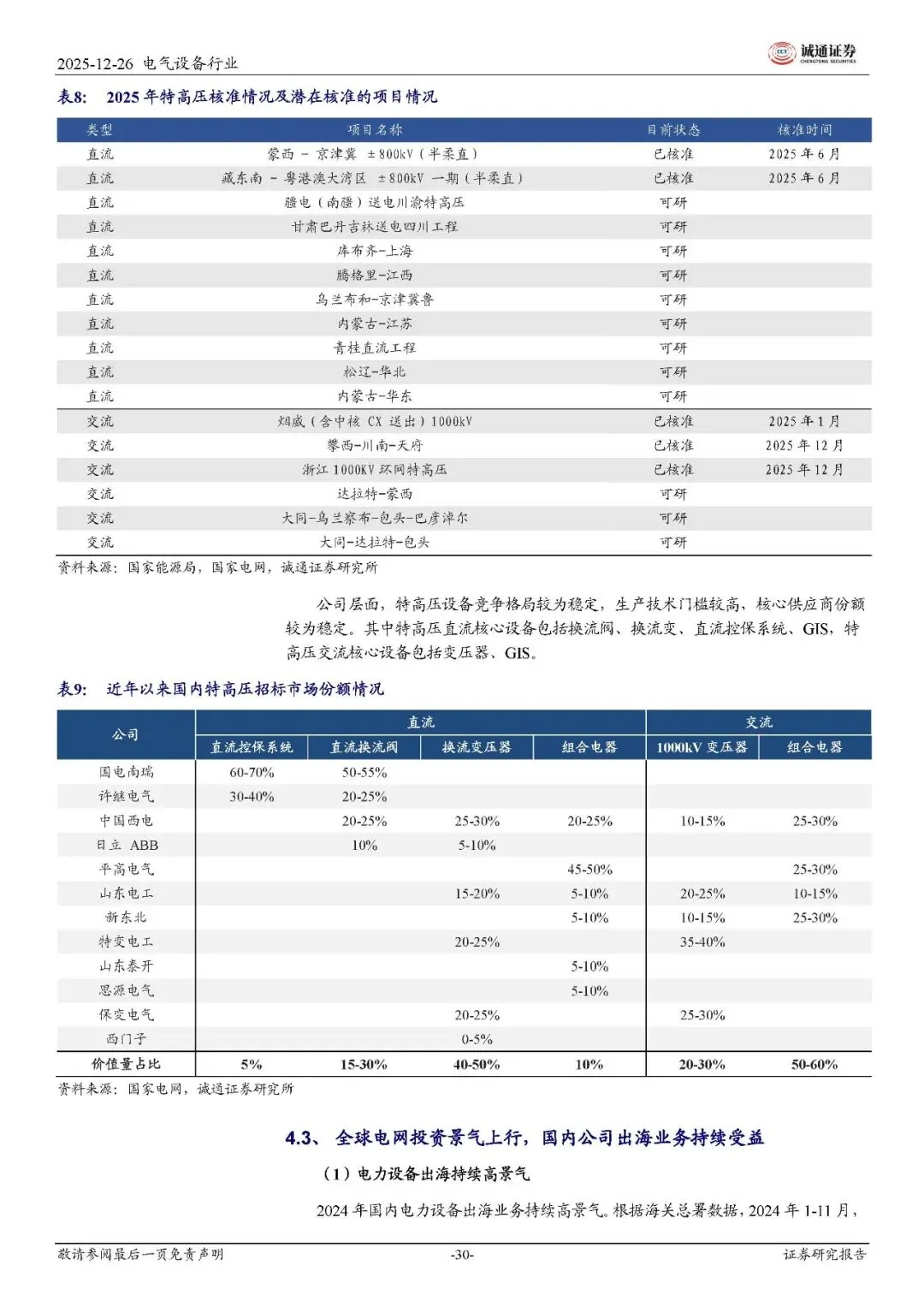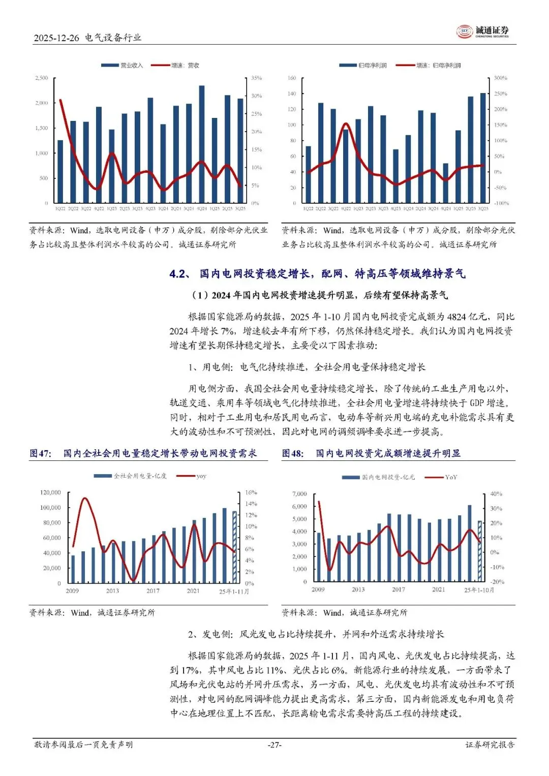 海外市场成为国内电网企业新增长点,2025 年 1-11 月,变压器、高压开关出口金额同比分别增长 30%、37%,特变电工、中国西电等企业凭借技术与成本优势,在东南亚、中东等市场持续突破。随着全球电网建设加速,国内企业在特高压、配网设备等领域的技术积累将转化为出口竞争力,出海业务有望保持 20% 以上增速。