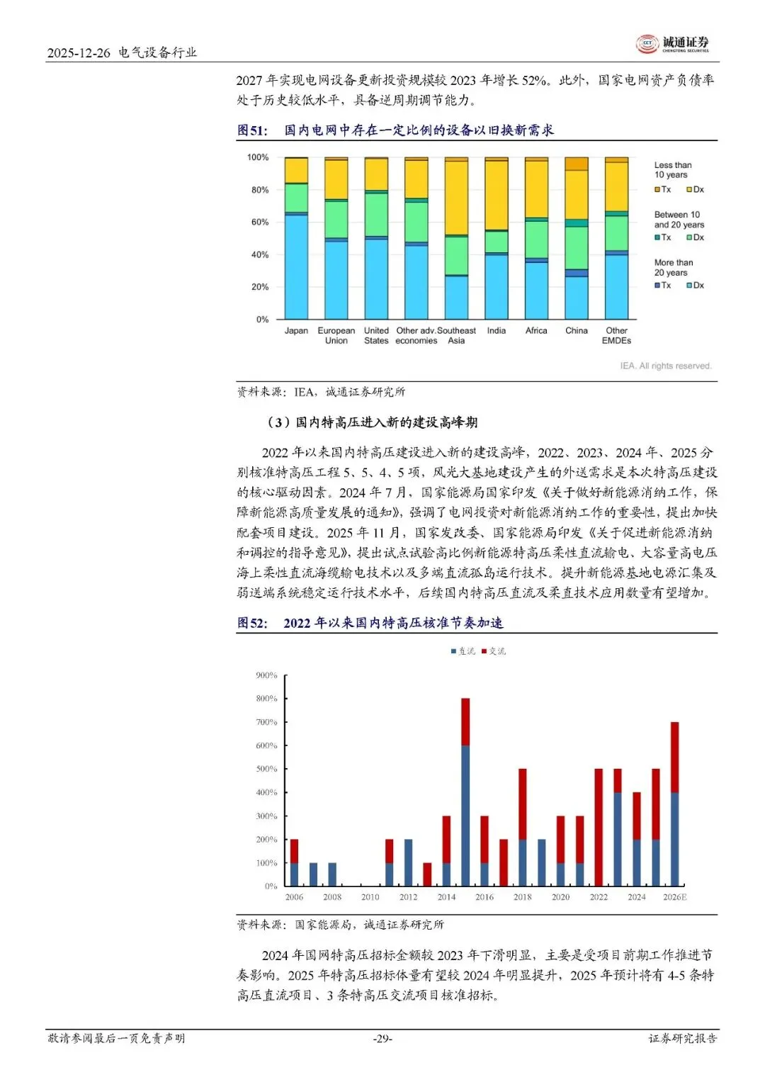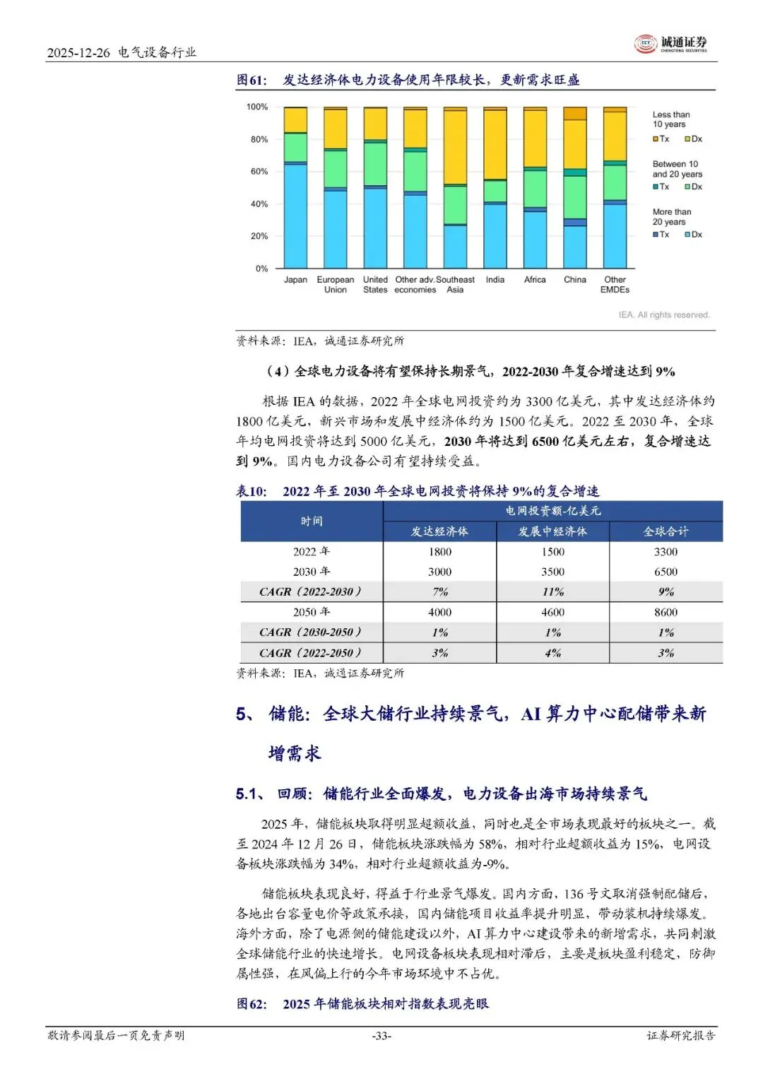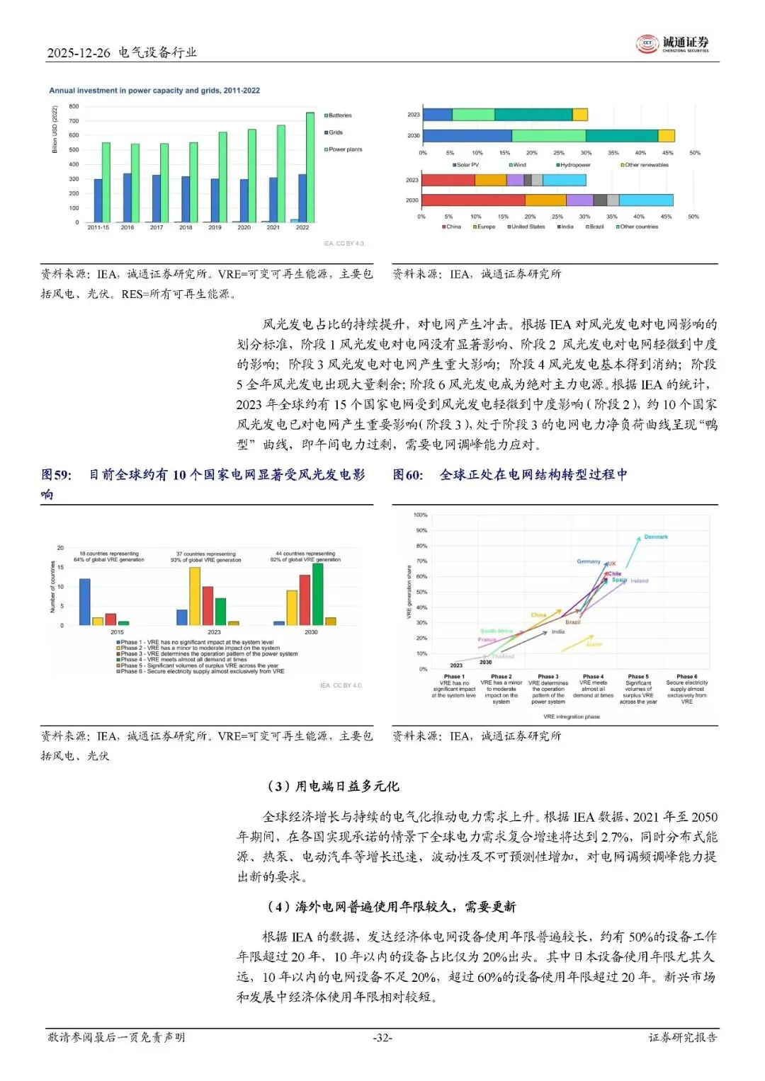 全球电网投资进入长景气周期,2022-2030 年复合增速预计达 9%,2030 年全球电网投资将达 6500 亿美元。核心驱动来自三方面:一是新能源消纳压力,全球风光发电占比将从 2023 年的 14% 提升至 2030 年的 30%,波动性电源占比提升倒逼电网升级;二是设备更新需求,发达经济体超 50% 的电网设备使用年限超 20 年,更新换代迫切;三是用电端多元化,电动车、热泵等电气化需求增长,对电网调频调峰能力提出更高要求。