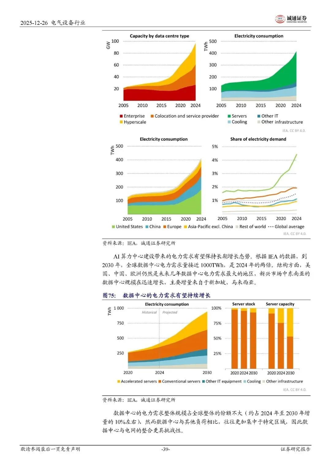 2026 年储能行业将延续高景气,预计全球新增装机 417GWh,同比增长 51%。核心增长动力来自三方面:一是国内容量电价政策全面铺开,内蒙古、甘肃、河北等多省区已出台补偿政策,商业模式持续完善;二是海外大储接力增长,欧洲独立储能 2025 年增速达 84%,美国表前储能装机保持 40% 以上增速;三是 AI 算力中心带来新增需求,全球数据中心电力需求预计 2030 年达 1000TWh,风光配储模式因经济性与环保优势成为优选,为储能开辟千亿级增量市场。