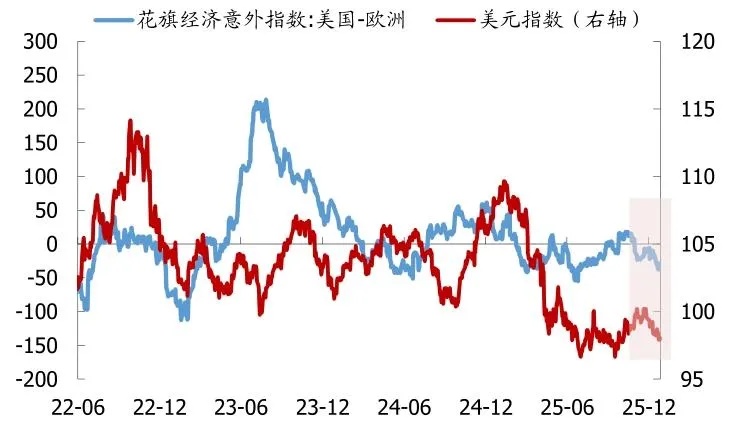 长期走势:美元指数自 2025 年 1 月中旬起明显转弱,从最高点接近110快速下跌至 7 月低点96.6左右,随后进入宽幅震荡;人民币升值是前期美元下跌的滞后反映(4 月前受中美关税升级压制)。 短期诱因:11 月底以来美元指数再度连续回落,从 100 出头跌至98附近,核心原因有二:①12 月美联储如期降息且表态偏鸽派,市场降息预期升温;②近期美国经济数据表现弱于欧洲,欧元在美元指数中占比高,“欧强美弱” 直接导致美元走弱。 年底企业集中结汇形成内部支撑