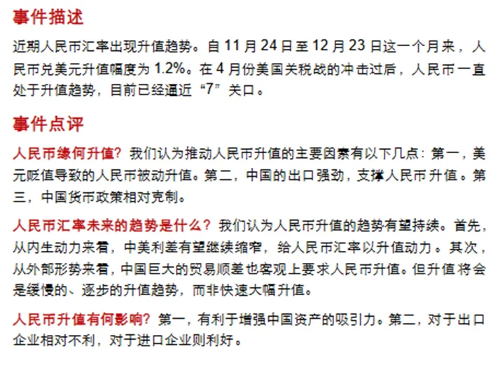 2025   11  24  —12  23 日的一个月内,人民币兑美元升值幅度达 1.2%,属于温和但明确的升值走势。