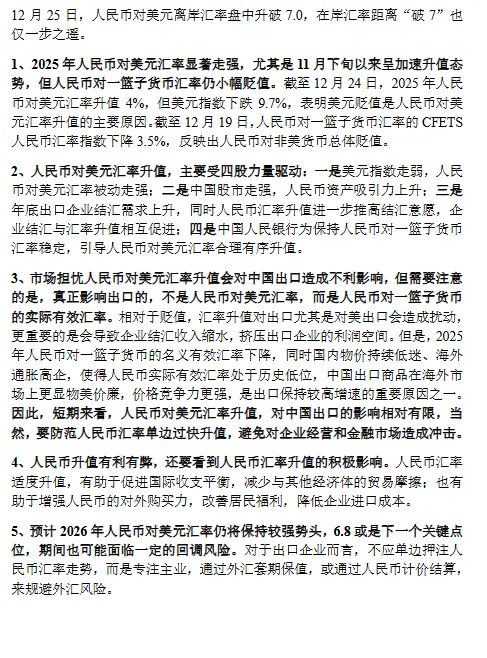 市场层面:美国经济承压、美联储降息,美元指数或继续走弱;中国经济回升向好、A 股牛市延续、出口韧性较强,人民币有升值动能; 政策层面:人民币汇率低于合理均衡水平,国内物价低、海外通胀高,存在补涨动能;适度升值有助于促进国际收支平衡、减少贸易摩擦、提升居民购买力与降低企业进口成本。 - 回调风险: