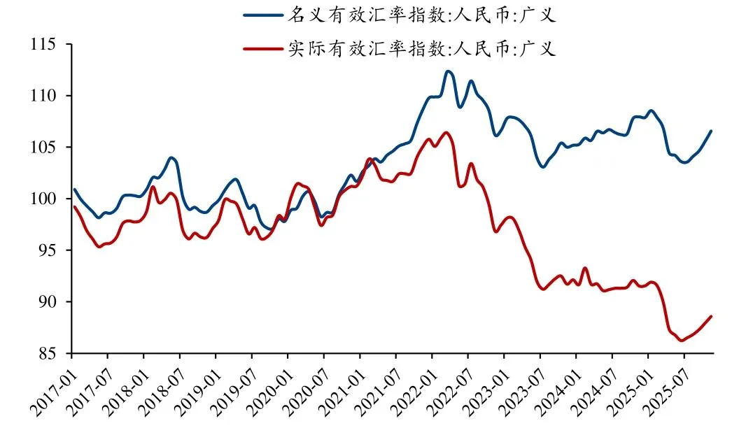 答案:核心依据是 “实际有效汇率处于历史低位”,具体逻辑如下:①影响出口的关键是人民币对一篮子货币的实际有效汇率(而非美元双边汇率),该汇率剔除了物价差异,直接反映商品真实价格竞争力;②2024-2025 年国内物价低迷、海外通胀高企,使得人民币实际有效汇率显著低于疫情前水平,中国出口商品 “物美价廉” 的优势突出;③非美市场对中国出口的重要性日益上升,人民币对非美货币总体贬值(CFETS 指数降 3.5%),有助于开拓非美市场,抵消对美出口的部分压力。