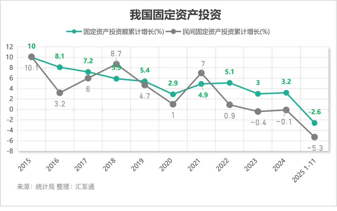 图2 我国固定资产投资额年度增速:2025年为-2.6%,其中民间固投增速为-5.3%