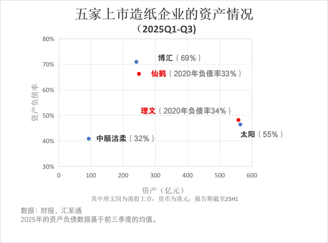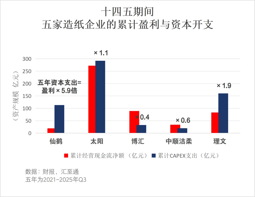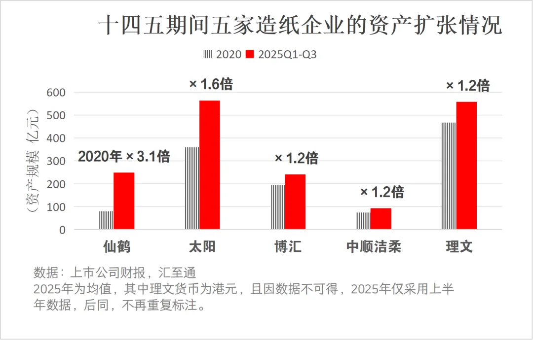 从微观来看,经营特种纸的仙鹤、生活纸-洁柔、文化纸-太阳、白卡纸-博汇,以及港股包装纸-理文,这五家企业在2021年-2025年实现了不同程度的扩张,其中仙鹤股份从2020年80亿的总资产扩张至超240亿,太阳也从360亿增至560亿。而另外3家企业的扩张较为稳健,只有20%的增长。