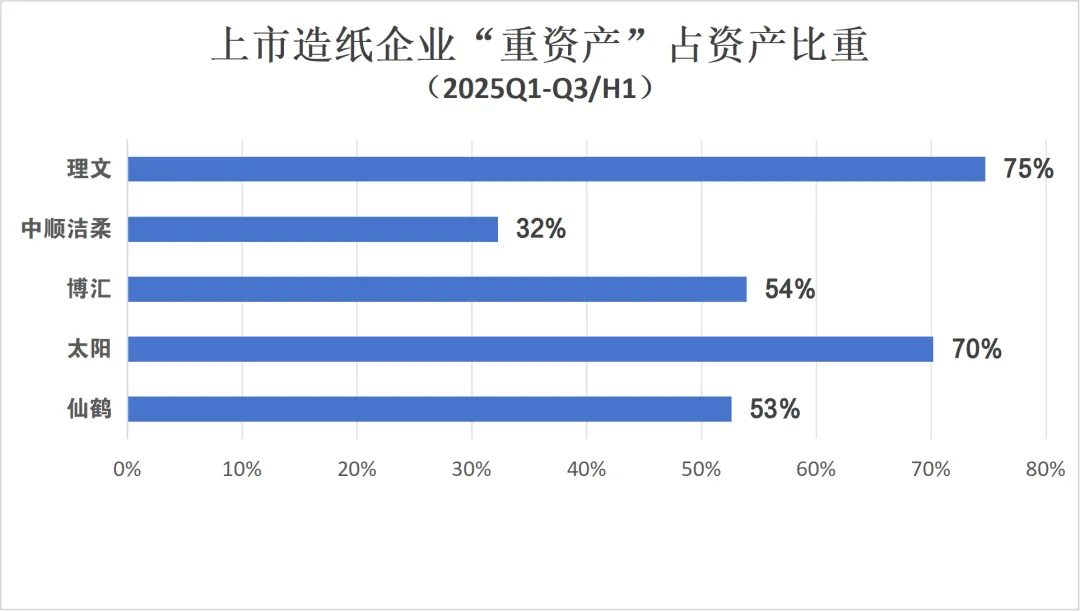 图5 除了中顺洁柔,4家造纸企业的固定资产等重资产占总资产的比例达到50%-75%