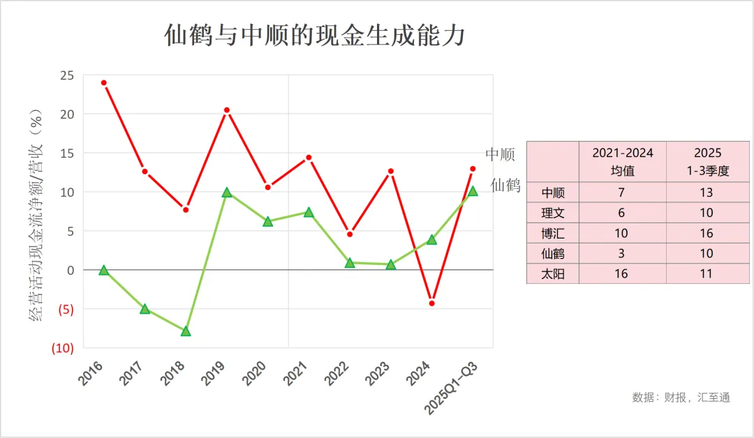 其次,从每100元营收给企业带来的现金流来看,仙鹤在2022-2023年经历了盈利的低谷,每100元营收带来的营业现金流竟然不足1元钱。中顺在2024年也经历了现金流亏损的局面,但随着2025年浆价长期处于历史较低位置(纸浆期货主力合约最大回撤23%,下行时间超8个月),当然也肯定离不开企业内部管理的提升、采销策略的调整等其他原因,中顺和仙鹤的现金生成能力得到了大幅的回暖——这样的趋势还需要更多时间观察。