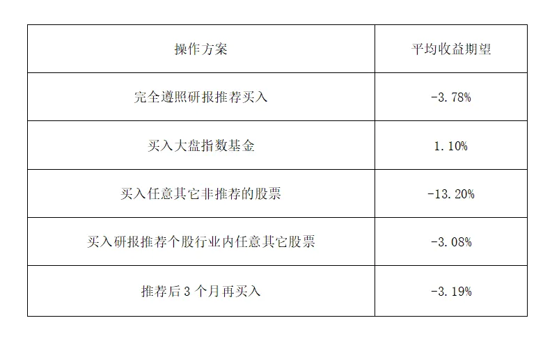 跟着个股研报买股收益如何?这里先给各位读者一个直观的数据,在我国的机构研报中给予个股以中性及以下评级(包括中性、减持、卖出三档)的数量占比不足千分之一,样本太小没有统计价值就不做研究了;而如果一直跟着研报的正向推荐买股票,即只要研报一推荐那么我就在下一个交易日买入并持股半年,这样操作的话平均年化收益率是-3.78%;