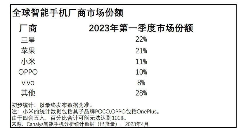 Canalys发布2023年第一季度(1-3月)全球智能手机市场份额TOP 5:三星 22%;苹果 21%;小米(含Redmi)11%;OPPO(含一加)10%;vivo(含iQOO)8%;Others其他品牌合计市场份额28%。在全球智能手机市场份额排名前5位的企业中,中国占3席。