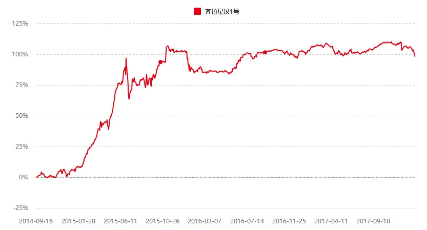 作为其中的代表产品,齐鲁星汉1号自2014年9月16日至今,收益几近翻倍,历史最大回撤仅有17%,发生在2015年的“股灾”期间。