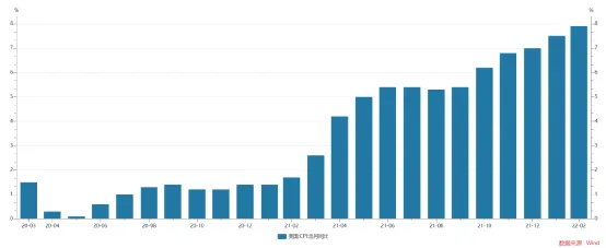 最新数据显示,美国2月CPI(消费者物价指数)年率未季调实际公布高达7.90%,欧元区1月PPI(生产者物价指数)同比大涨30.6% 。美联储和欧洲央行均表示通胀可能比预期更久。这意味着从去年就开始的通胀尚未迎来拐点,通胀大概率仍将继续。下图是2020年新冠疫情后,美国CPI走势图。