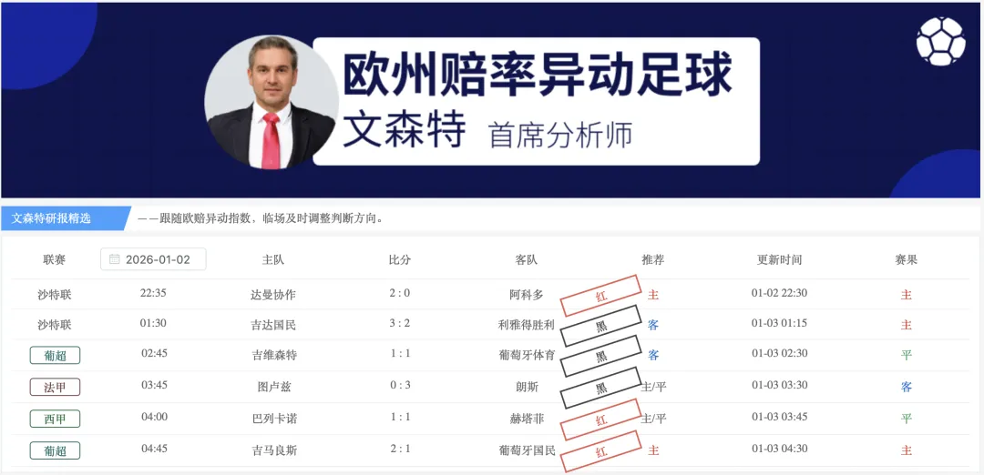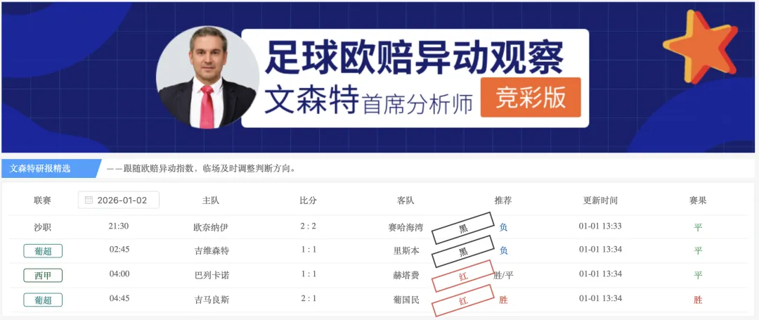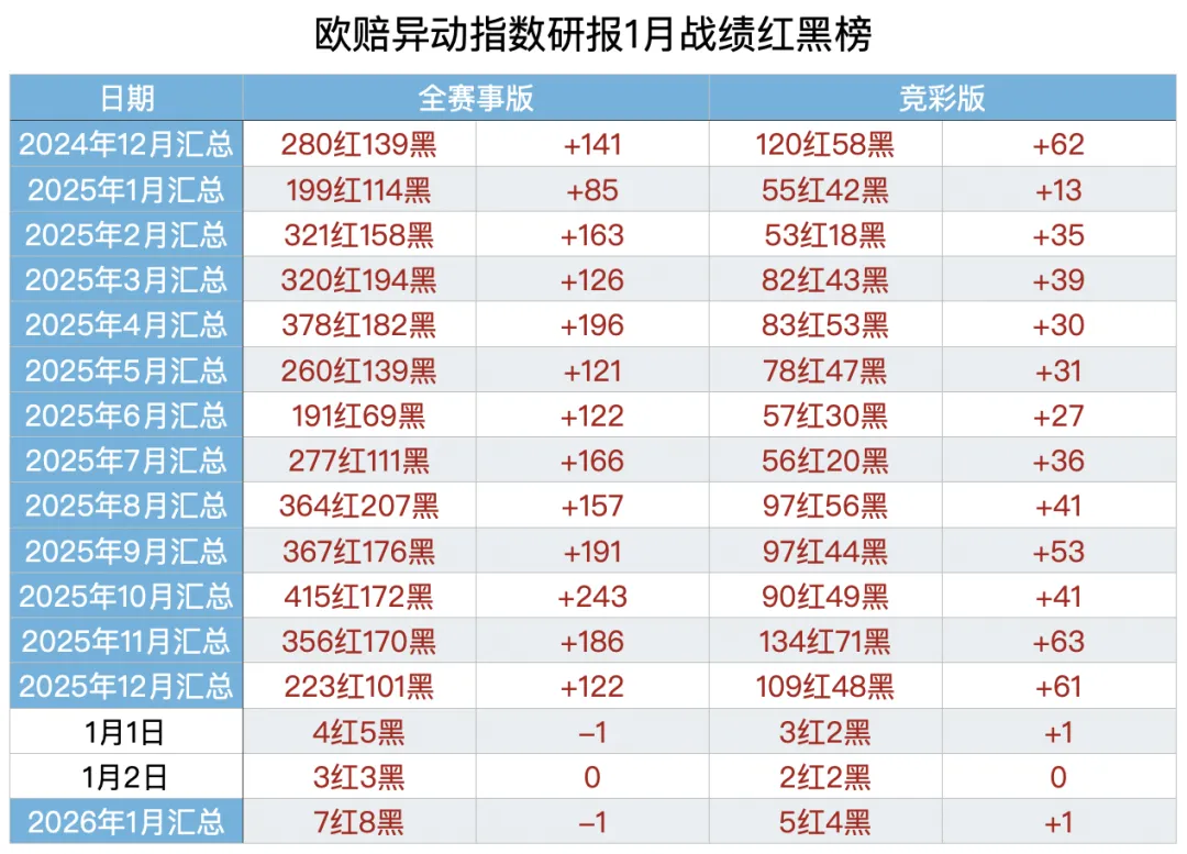 【欧指异动指数】(竞-彩版)栏目的研报给出4场比赛,2红2黑,1月累计5红4黑,净胜1,观察20家主力公司的临场指数变化,掌控比赛方向,1月稳定性达到55.6%。