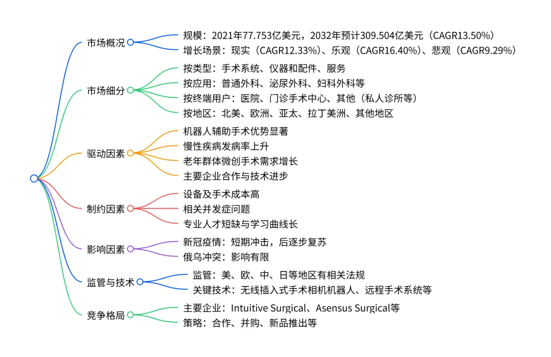 2021年全球手术机器人市场规模达77.753亿美元,预计2032年将增至 309.504 亿美元,CAGR 为 13.50%,市场受机器人辅助手术的诸多优势、慢性疾病发病率上升、老年群体对微创手术的青睐等因素驱动;北美和欧洲凭借先进的医疗体系占据主要市场份额,而亚太、拉丁美洲等地区将实现显著增长;市场主要分为手术系统、仪器配件和服务三类,应用覆盖普通外科、泌尿外科等多个领域,但同时面临设备购置成本高、专业人才短缺等挑战,未来人工智能与手术机器人的融合将成为重要发展趋势。