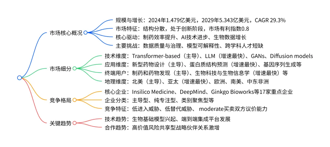 2024-2029 年全球生物学生成式 AI 市场呈加速增长态势,2024 年市场规模达1.479 亿美元,预计 2029 年将增至5.343 亿美元,期间复合年增长率(CAGR)为29.3%,增量增长达3.864 亿美元;市场结构分散,技术端以Transformer-based为主导(2024 年市场份额 40.7%),LLM为增长最快细分领域(CAGR 32.7%);应用端新型药物设计占比最高(2024 年 37.4%),蛋白质结构预测增长最快(CAGR 32.3%);终端用户中制药和药物发现是核心领域(2024 年 47.3%);地理端北美为最大市场(2024 年 38.2%),亚太地区增长最快(CAGR 33.2%);市场驱动因素包括制药效率提升需求、AI 技术进步和生物数据增长,核心挑战为数据质量与治理、模型可解释性及跨学科人才短缺,竞争格局由专业 AI 生物科技公司、大型药企和科技巨头共同构成。