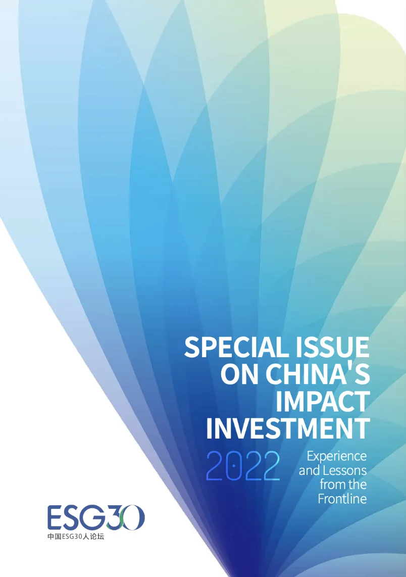 近日,由中国ESG30人论坛出品的《中国影响力投资特别报告2022:经验与前瞻》(SPECIAL ISSUE ON CHINA’S IMPACT INVESTMENT 2022——Experience and Lessons from the Frontline,下称《报告》)在2022年中国国际服务贸易交易会“ESG与可持续投资国际论坛”上正式发布。这份英文报告通过案例研究,总结了中国影响力投资发展的经验,并对影响力投资在新兴市场的进一步发展作出展望。