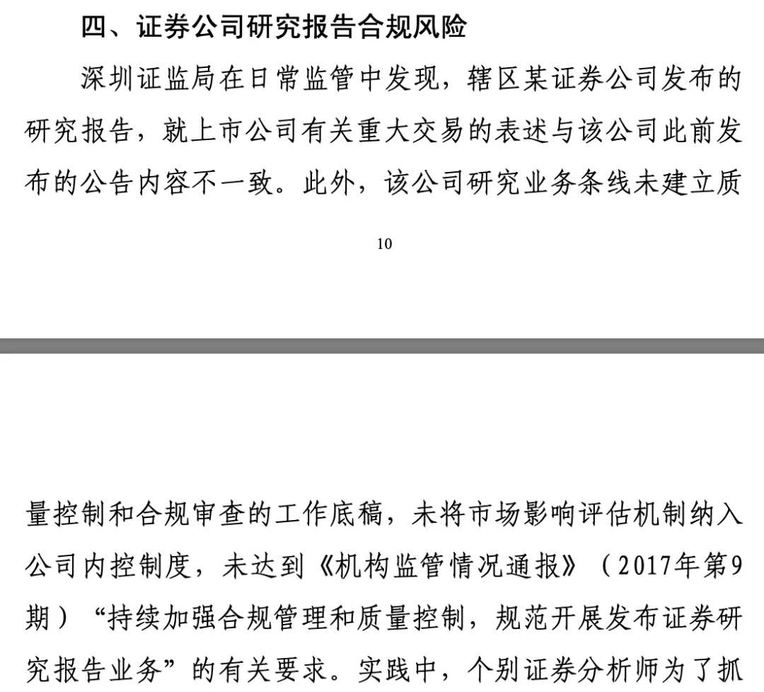 根据监管公告,深圳证监局在日常监管中发现,辖区某证券公司发布的研究报告,就上市公司有关重大交易的表述与该公司此前发布的公告内容不一致。