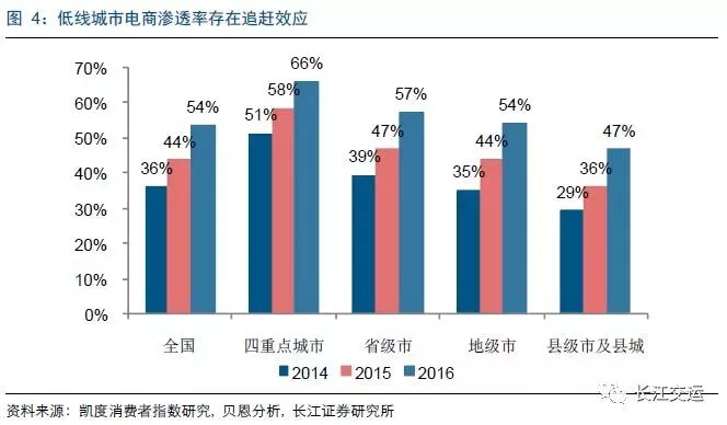 低线城市电商发展存在追赶效应。根据凯度消费者指数研究,2016年北上广深四重点城市电商渗透率已达66%,而县级城市的电商渗透率仅为47%,中国各等级城市间的电商渗透率差距较大。