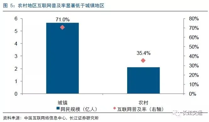 农村地区电商发展潜力巨大。根据中国互联网络信息中心的数据,截止到2017年12月,我国农村网民规模达到2.09亿人,较2016年底增加793万人,体量规模难以忽视;从互联网普及率来看,中国农村地区互联网普及率仅为35.4%,远低于城镇71.0%的普及率。