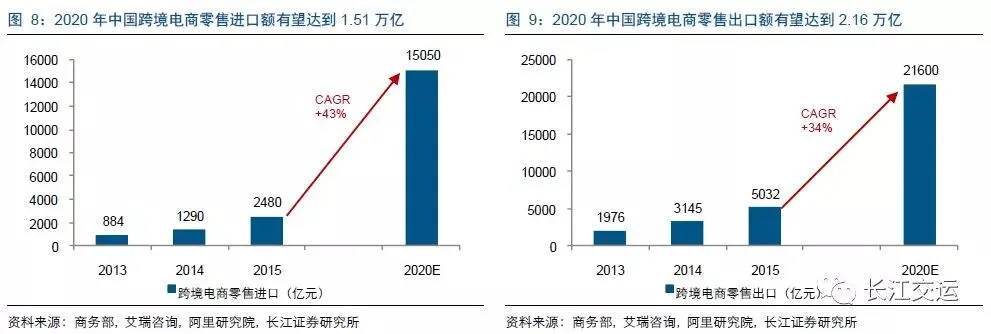 跨境电商发展方兴未艾。从海外电商渗透率来看,欧美发达国家电商渗透率中位数水平不到10%,而新兴市场电商渗透率同样处于较低水平,未来提升空间较大(JP Morgan预计美国网购零售额占社会总零售额比重未来有望突破30%[2] )。阿里巴巴倡议的“eWTP”有望加速推动全球跨境电商的发展。根据阿里研究院的预测,2020年中国跨境电商零售进口额和出口额将分别达到1.5万亿元和2.2万亿元。