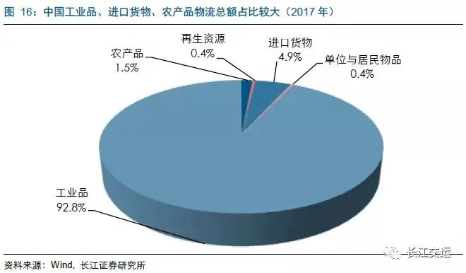 生产流通领域的快递需求规模或不亚于电商。从社会物流总额来看,2017年中国工业品物流总额高达234.5万亿元,占比为92.8%;进口货物与农产品方面的物流总额分别为12.5万亿元和3.7万亿元;而单位与居民物品的物流总额仅为1万亿元。我们判断,中国生产流通领域以及商贸流通中段的快递需求或不亚于电商所产生的快递需求。