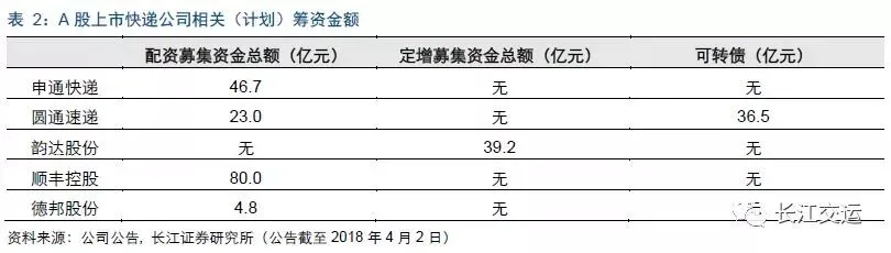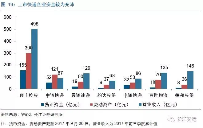 现金流充裕,扩张动力强。当前中国一线快递企业均已完成上市,从资产负债表来看,快递企业整体现金流较为充沛,截止2017年9月底,上市快递企业均持有近十亿以上货币资金。随着募投、定增资金的陆续到位,将进一步为企业的转运中心建设升级、网络运能扩张,以及综合化转型提供充足资金。