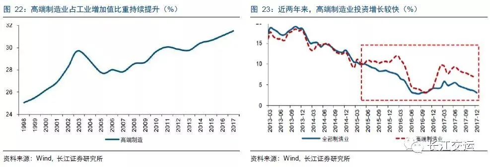 “中国制造2025”全面实施,加速中国制造业产业升级。根据长江宏观小组的研究,伴随产业结构的优化,我国高端制造业占全部工业增加值比重持续提升,从1990年代末的25%左右,提升至近年来的31%左右。2016年底,工业和信息化部会同有关部门编制实施了“1+X”体系,大力推进各项政策分解细化和落地实施,标志着“中国制造2025”已进入全面实施的新阶段。