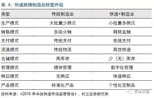 消费与制造业的加速升级,有望进一步催生快递需求。2017年3月,国家邮政局发布的《快递业发展十三五规划》中提出:快递业务板块由“1+1”向“1+3”拓展,重点聚焦电子商务、制造业、跨境贸易等领域,产业链进一步延伸。在标准快递和国内电商快递基础上,着力发展服务先进制造业快递和跨境电商快递。