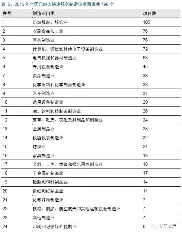 快递对接“中国制造2025”。国家邮政局提出快递要对接“中国制造2025”,不断延伸快递服务领域。目前已经形成入厂物流、仓储配送一体化、末端配送、供应链管理、嵌入式电商快递等多种服务模式,并涌现出比亚迪、小米、上汽通用等一批龙头项目,服务领域涵盖航天、汽车、电子、制药、服装、酒、食品等多个领域。