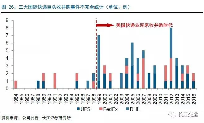 90年代末,美国快递业整体增速放缓,巨头主要通过兼并收购方式,迅速成为领先的综合物流服务商。1984-1998年,三大国际快递巨头(DHL、UPS和FedEx)年合计并购案例平均不到1例,而1999-2016年,每年合计并购案例平均超过3例。