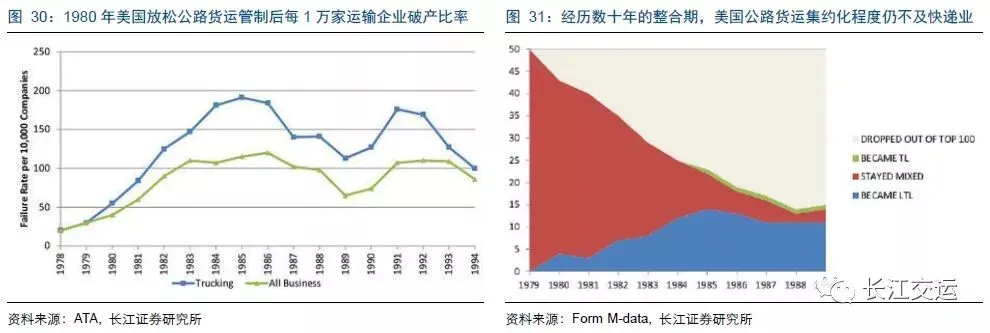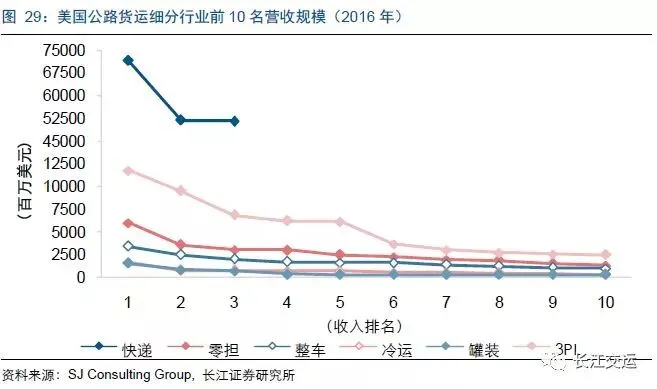 对比美国公路货运细分行业前十名营收规模发现,快递业的集约化程度远高于其他公路货运行业,在企业营收规模与市场集中度这两方面可见一斑。2016年,美国快递行业(剔除企业经营的快运及第三方物流业务)收入门槛约为500亿美元,而其他货运行业龙头的收入上限为120亿美元(若剔除轻资产的3PL,则收入规模上限仅为59亿美元)。