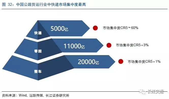 根据运联传媒的数据,中国公路货运行业中的快递、零担和整车市场规模分别约为0.5、1.1和2.0万亿元,市场集中度CR5分别约为60%、3%和1%。