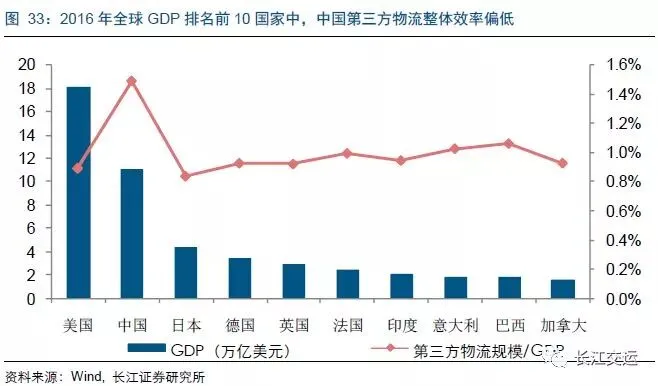 在全球GDP排名前10名的国家里,我们发现中国“第三方物流规模/GDP规模”这一指标达到1.5%,远高于其他国家1.0%的平均水平,也高于印度、巴西等金砖国家的水平。尽管中国第二产业结构占比较高,但这仍能在一定程度上反映中国第三方物流资源冗余较多,存在较大的整合空间。