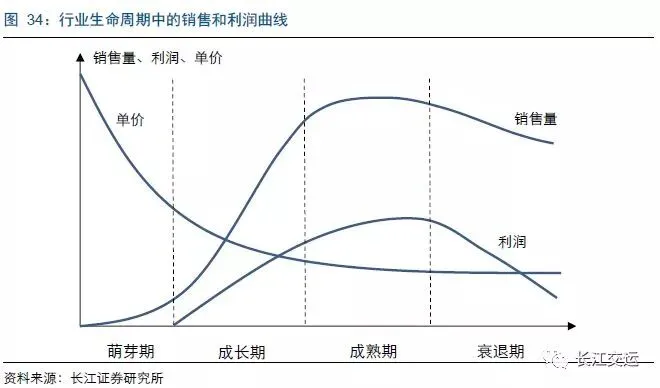 根据传统的行业生命周期理论,处于成长期的行业,收入和利润规模快速上涨,尽管面临较大的竞争风险,但行业景气度持续向上,业绩与估值有望迎来双升;处于成熟期的行业,渗透率逐渐饱和,销售规模趋于平稳,资本开支下降,竞争格局稳固,行业竞争将从价格手段转向非价格手段,行业整体盈利水平回升,主要挣业绩增长的钱。处于衰退期的行业,市场开始收缩,收入和利润增长停滞,部分企业开始积极转型。