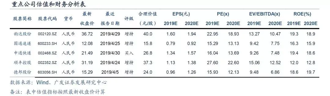 3)产能投入均衡化将加速成本端改善。补产能短板将进一步释放规模优势,加速成本优化;2019年,三通一达都将集中优化产能、补短板,现金流优质的公司或将在成本与现金流的循环中演绎强者恒强。